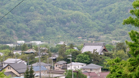 寺の裏手から見える上の段丘 樹林によって縁どられている
