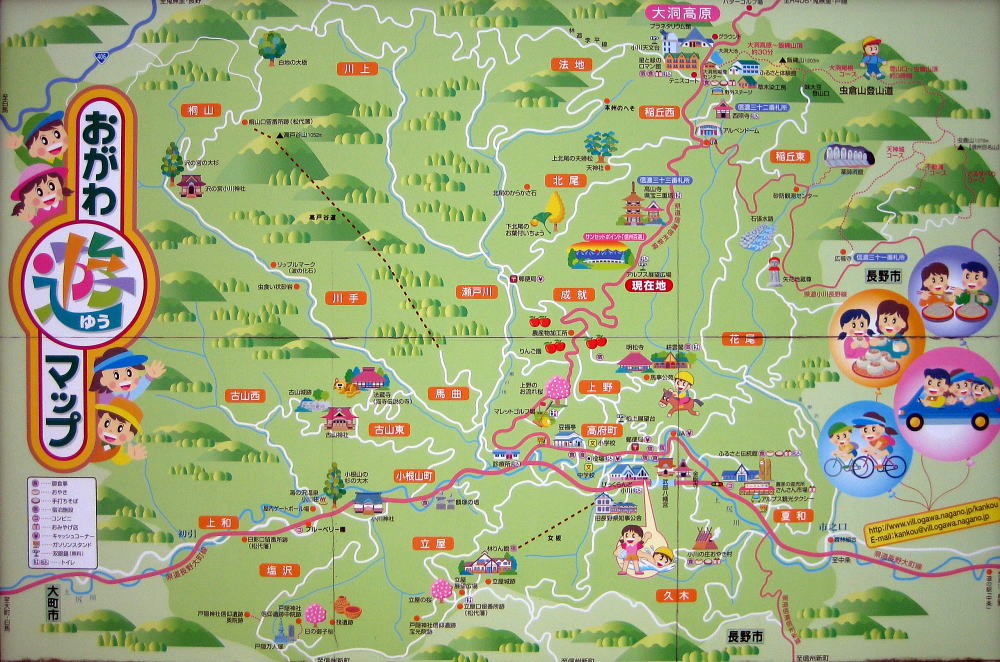 この道路の北の端に「大洞高原」がありますが、ここはキャンプ場や天文台、宿泊施設「星と緑のロマン館」など多様なレジャー・保養施設が集中しているエリアです。大洞高原が小川村の北の境界で、ここを越えたところは鬼無里、さらに街道を北東に進むと戸隠にいたります。