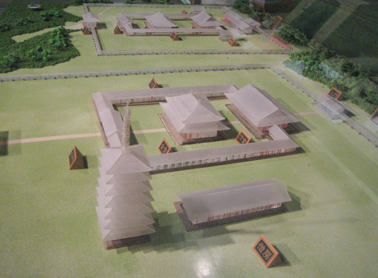 天平の創建時の信濃国分寺の建物群の復元イメージは、左の画像のようなものだったらしい(模型:上田市の信濃国分寺資料館所蔵)。平城京にある総国分寺、東大寺を模して、大和王権が抱える建築専門家を派遣して、建造されたことが、古代の記録で確認されている。