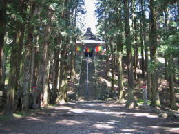 仁王門を入ると、杉の巨木からなる林が迎えてくれます。樹林は陽射しを遮っていて、参道は薄暗くなっています。