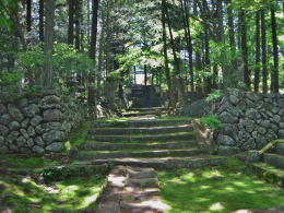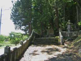 丘陵の裾沿いを走る途を渡ると、参道の石段。そこを右手に曲がると森のなかを緩やかに登る参道。