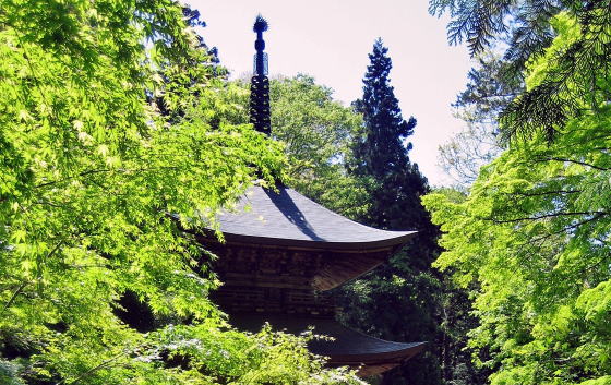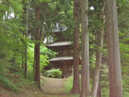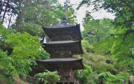 目指す三重塔は境内の南端、樹林の奥に位置しています。下層から上層までの屋根の逓減率は小さいので、塔の高さが強調されることもなく、小ぢんまりした印象です。