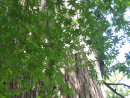 境内めぐりは里山の森の散策です。茂みに種子から発芽したばかりの双葉を見つけることもあります。幼木や若い盛りの樹木もあれば、老大木も大切に保護されているようです。