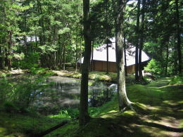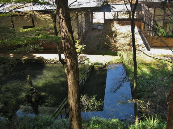 【写真下】欝蒼とした木陰の池の水面は木漏れ日を浴びながら、鏡面のように明るい青空を映して輝いています。