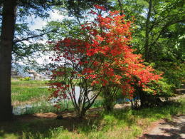 ところで、湖畔には5月中旬から下旬になると、みごとな花を咲かせるツツジが数本あるのです。花の色や葉の形などからすると、どうやらレンゲツツジらしいのです。