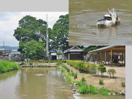 公園の四囲には浅い水路がめぐらされていて、感じのいい水場の景観をつくり上げています。池にはコイやフナやハヤなどがいますが、近隣の川や用水とつながっているので、自由に出入りしているようです【写真下】。
