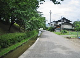 伴野氏の野沢城の名残りをとどめる土塁の堤は、今では桜並木となっています。春には桜が咲き誇ります。