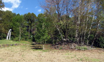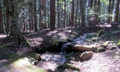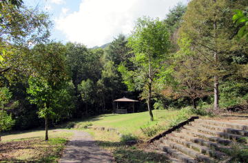 さらに先に進むと、森のなかを東西に水量が多い渓流が横切っています。天竜川の支流、鼠川の上流部でしょうか。橋を渡るとまもなく、森が切り開かれたような広場に出ました。駒ケ根高原家族旅行村アルプス広場の北の端に出たようです。 |