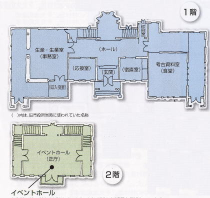 この建物は、大正11年に旧赤穂村役場として、伊藤文四郎工学博士による設計によるものです。アメリカ合衆国開拓期のコロニアル様式――大航海時代以降、ヨーロッパ人が開会植民地に建てた建築様式――を外形に取り入れ、内装ではこれにルネサンス様式を加味してあるのだとか。