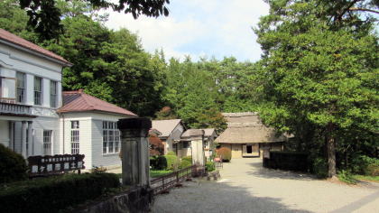旧竹村家住宅の隣にあるのは、建築様式が対照的な駒ケ根市郷土館。大正時代の洋風建築です。