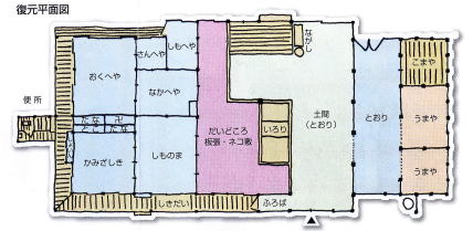 住民の通常の入り口は土間で、裏に通りぬけられる造りです。土間は板敷ないしネコ敷の台所や囲炉裏と隣接し、その外側(右側)には土間通路に沿って「こまや」と「うまや」が並んでいます。「うまや」の右側の「とおり」は、馬を用いたり世話するために、表から裏に通り抜けられるようにしてあるようです。