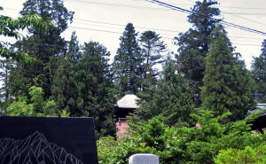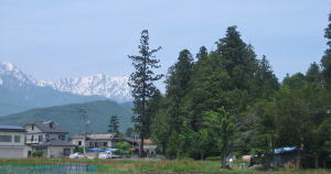 ▲アルプス山麓の鎮守の森: 蓮華岳を背にして(初夏6月の風景)