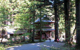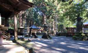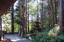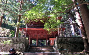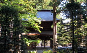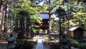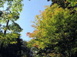 光前寺の取材に訪れたのは10月の中旬ですが、山門前のカエデの梢を見上げると、陽当たりの良い先端部の紅葉が始まっていました。深い山林で陽射しが遮られる境内では、あと2週間ほどするとカエデの紅葉が見られるでしょう。