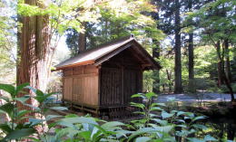 弁天堂は一群の杉の大木に囲まれていて、その西側のさらに奥には経蔵があります。経蔵も弁天堂と同じように巨木に取り囲まれていて、森はあたかも堂宇を守る衛兵のように屹立しています。