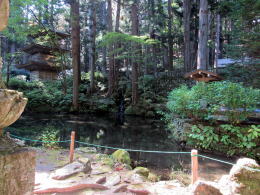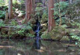 背後の山林から流れ出てきた水は本堂の南側に池をなし、境内を縦横に流れる水路の一環をなしています。