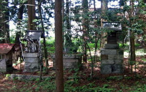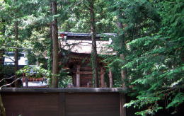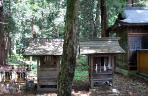 拝殿の奥のヒノキやサワラの樹林のなかには、境内社の木製の社殿や石造りの小さな祠が数えきれないほど並び、あるいは点在しています。