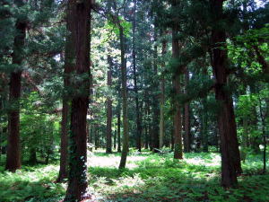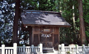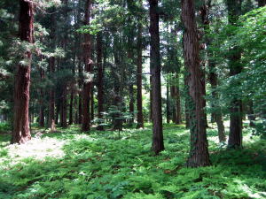 境内北側(拝殿の裏手)には、ヒノキやサワラの広い樹林があります。そして、背の高い針葉樹が境内全体を取り囲んでいます。遠くからでも鬱蒼たる森が見え、この神社の存在を知ることができます。