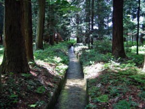 上の写真は、直径1.8メートルほどの切り株跡に育った若い杉の根元を写したものです。樹木は代を継いで神域を守っていくのですねえ。