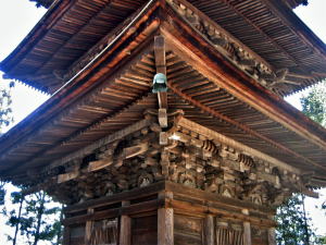 この「どっしり感」をもたらす構造のため、各重の屋根は堂舎に比べて小ぶりに見えます。屋根の形状が羽を広げた鳳凰のような大宝寺の三重塔の構造とは、きわめて対照的です。