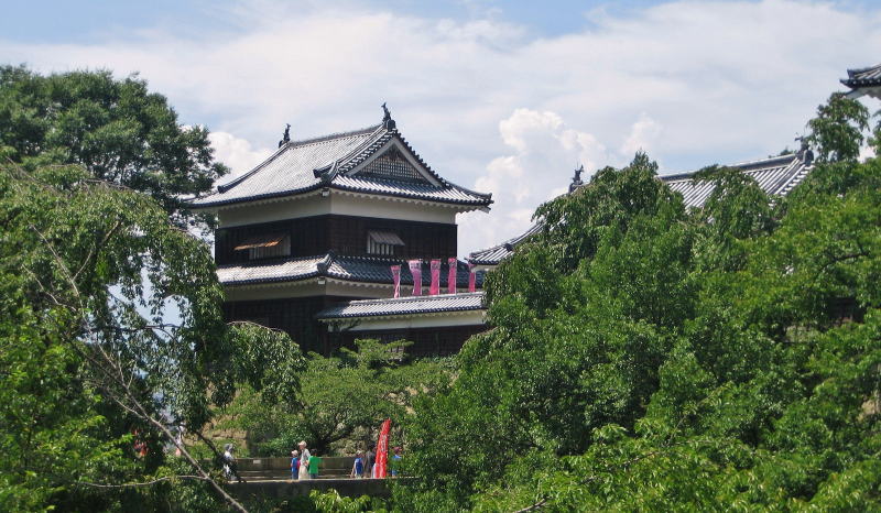 左の風景は、真夏、豊かな緑に囲まれた上田城の南櫓と櫓門。
