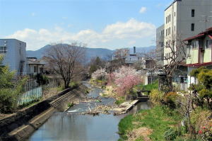 今回は、矢出沢川――上田城の北側の外堀――の河畔を川の流れに沿って散策してみます。めぐり歩く区間は、北国街道上田宿柳町の神宮橋辺りから始まって、高橋の下手、「蕎麦店くろつぼ」や「そえるカフェ」の裏手で川が曲がって南に向きを変える辺りまでとします。