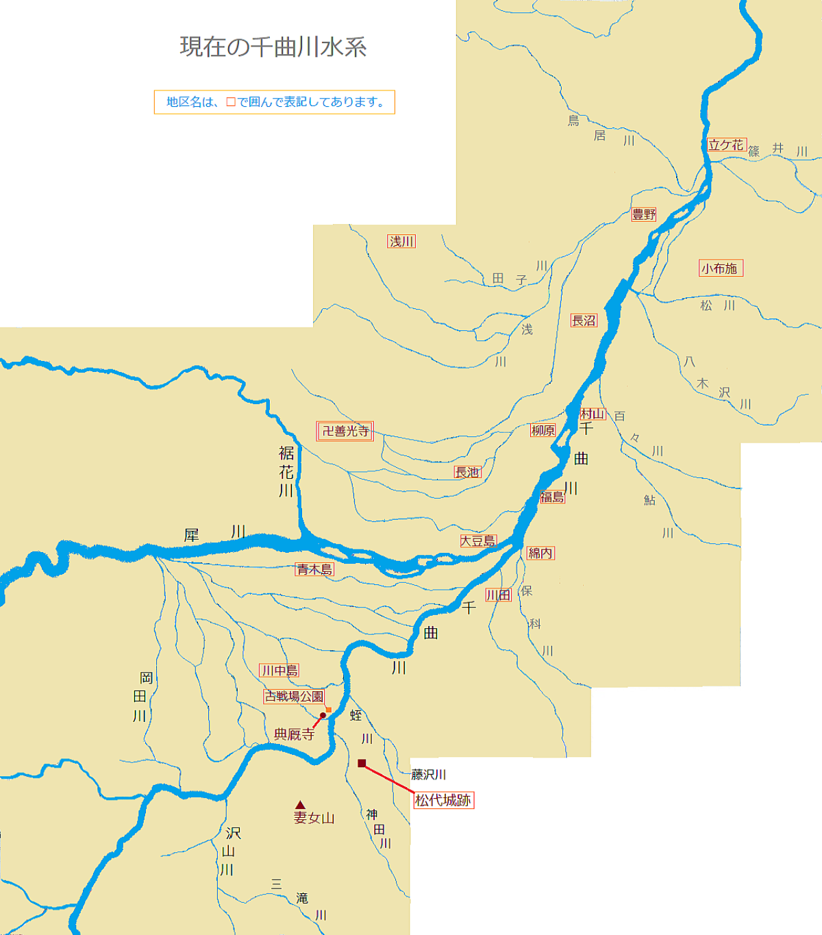 下の図は、現在の千曲川・犀川水系を示す絵地図です。