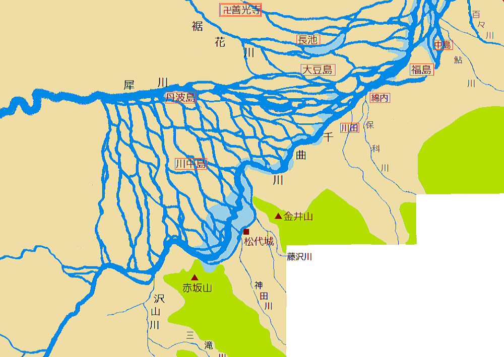 こうして、妻女山の麓から松代城を経て金井山の北麓、芝と千曲川主流のあいだは湿原・沼地で、さらに清野から現在の古戦場公園、さらに神明、小島田にいたる川沿いの一帯も湿原、沼地だったと見られます。湿地の一部は1960年代まで残っていました。このような湿地が千曲川と犀川沿いのいたるところにあったようです。【⇒現在の千曲川水系】
