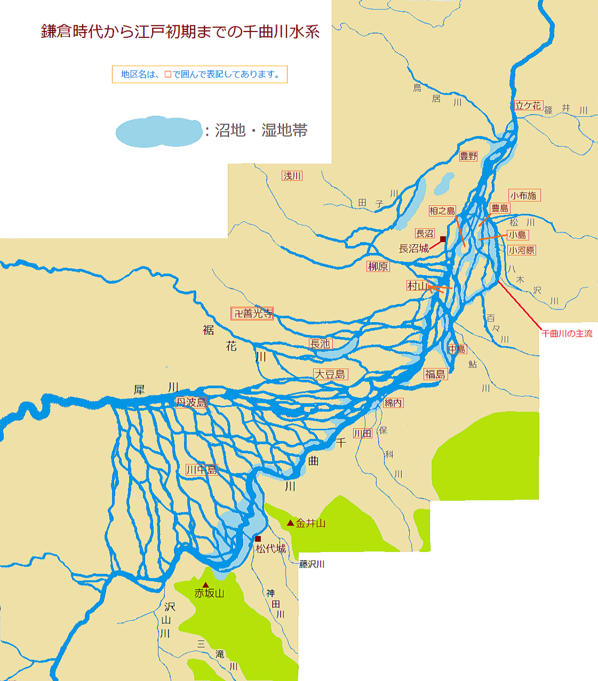 下の絵図は、千曲川・犀川水系の歴史的変遷を追跡するために、私が作成した、鎌倉時代から江戸初期(15世紀〜17世紀はじめ)までの千曲川=犀川水系の古地理の推定図(想像図)です。