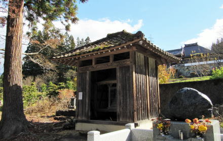 現本堂は江戸中期の再建によるもので、越後の弥彦神社の宮大工集団の手になるものだということが、棟札に記されていたそうです。今は金属板が葺かれています。他方、山門(薬医門造り)は元禄時代の建築(再建立)だということで、重厚さと端正さをともに備えています。