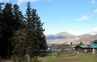 ▲境内の北の彼方にそびえる高社山