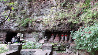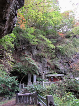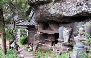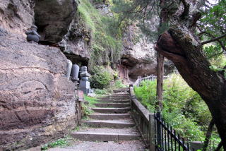 仁王門で一休みし、そこから崖に囲まれた谷間のつづら折れの小径をふたたび登りきった岩棚壇上で、私たちはこうした建築物や文物を見て回ることができます。この岩棚壇と参道は、布引の岩山断崖の頂部近くにあります。