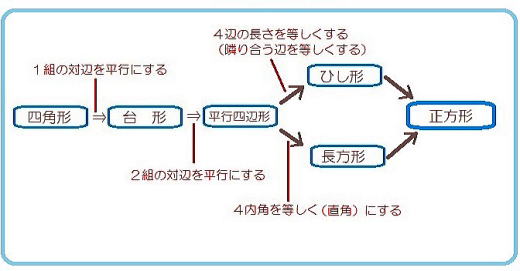 四角形のうち、1組の対辺が平行なものを台形と呼び、2組の対辺とも平行なものを平行四辺形と呼び、平行四辺形のうち隣辺が直交するものを長方形と呼び、長方形のうち隣辺の長さが等しいものを正方形と呼びます。この説明の順序は、より大きな集合から小さな部分集合へと四角形の属性を増やしていく流れです。